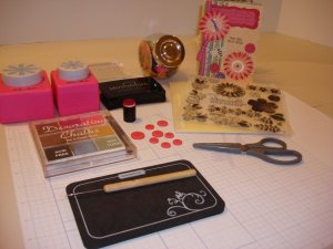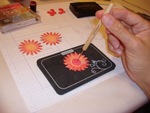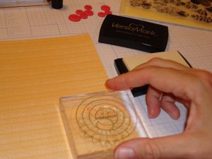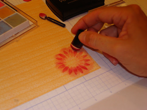 First, place the acrylic stamp on acrylic block and ink with VersaMark Ink Pad to stamp your patterned paper. Second, use sponge applicators to apply the lightest chalk first around the center of the flower stamp working your way out in a circular pattern.
