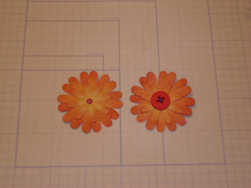 You can use buttons, or brads to hold the layered flowers together and create the center of the flower. Personally, I love to hand sew buttons unto the flowers. Next post will show how to use Versa Mark Ink to make similar embellies.