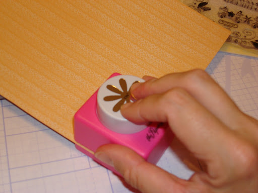 Creating coordinating embellishments for your projects is more cost effective and more rewarding than running out to the store to buy them. You can save time by using paper punches to create your own handmade flowers. I am using a Bella Scrapbook Kit to make these paper punched flowers to coordinate with some projects I am going to create. Let me show you how easy this can really be. I am using one 12 X 12 piece of patterned paper, two flower paper punches of different sizes, decorating chalks, sponge daubers, buttons, and embroidery floss.