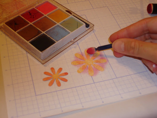 Once I have picked out coordinating paper, I like to punch out two different sizes of flowers for my embellies. From there, I chalk my flowers, making sure to use the lightest color first, with a sponge dauber. I start in the center of my flower with the lightest color, and work my way to the edges with a darker color. This creates a layered effect which really makes my flowers “pop”!