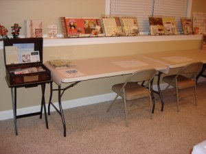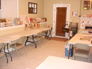 This is my Scrapbook Club Room! This is my slice of scrapbook heaven! I like it so much, I move my projects out of my little scrapbook room and out into this big room from time to time. I can fit fourteen scrapbookers pretty comfortably, but seven scrapbookers allows them to have a whole six foot table to themselves!