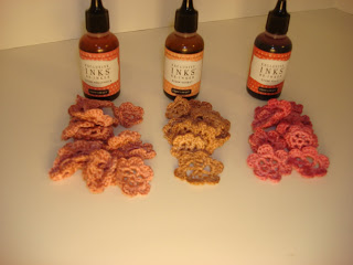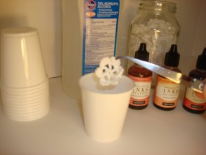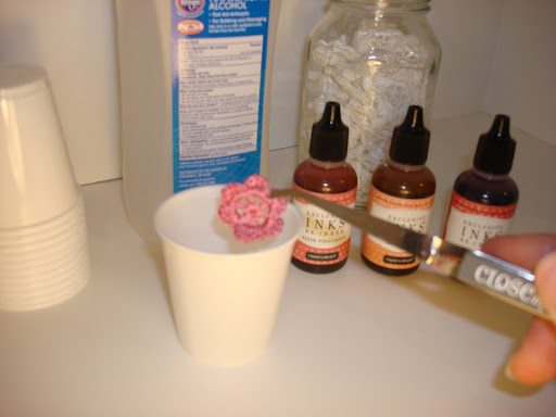 Pour in the desired amount of rubbing alcohol into the plastic cup. Add a few drops of re-inker. Taking my tweezers, I pick up one flower and stir the rubbing alcohol/re-inker to mix in the dye. I add more re-inker to darken the color to my liking. If the color is too dark, just add more rubbing alcohol.