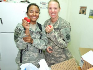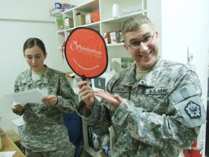 No, we are not stressed in Iraq! Well, not now that we received our sweet care package from the Manhattan Chamber of Commerce, anyway! Of course, the Soldiers loved the Girl Scout cookies, but they really had fun with the stress balls and fans. Don’t these pictures just crack you up!