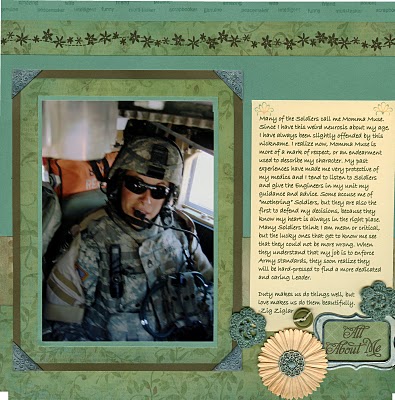 Anyway, I based the whole scrapbook around the different ups and downs I sometimes face. There is a song by Nickleback called “If Today Was Your Last Day” and this song really keeps me going through the difficult times and really helps push me to be a better person. Every title for my scrapbook layouts is in this song. This particuliar page talks about the Soldiers in my unit calling me Momma Muse, which I hate, because I am pretty much in denial about my age!