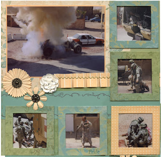 I loved creating this scrapbook layout when I was in Iraq. I had really been avoiding scrapping my first deployment for SO MANY reasons. I didn’t realize how many emotions, blame, guilt, and anger I had been harboring for nearly three years. The photos in these pages were taken at the National Training Center at Fort Irwin, California. The Army has spent millions of dollars making our training prior to deployment as realistic as possible.