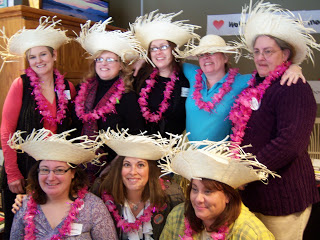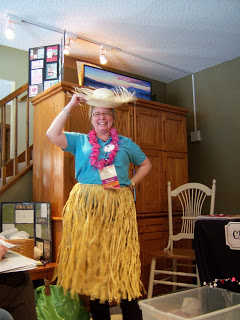 Anyway, a few of us crazy yet daring loony gals are setting our sights on earning this trip! So, that is why Jillene has a hula skirt, straw hat, and lea around her neck! So all of us courageous souls that decided to take the challenge donned our Hawaii gear for a picture!
